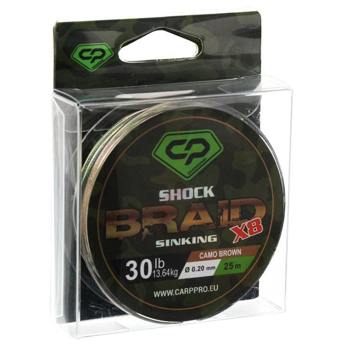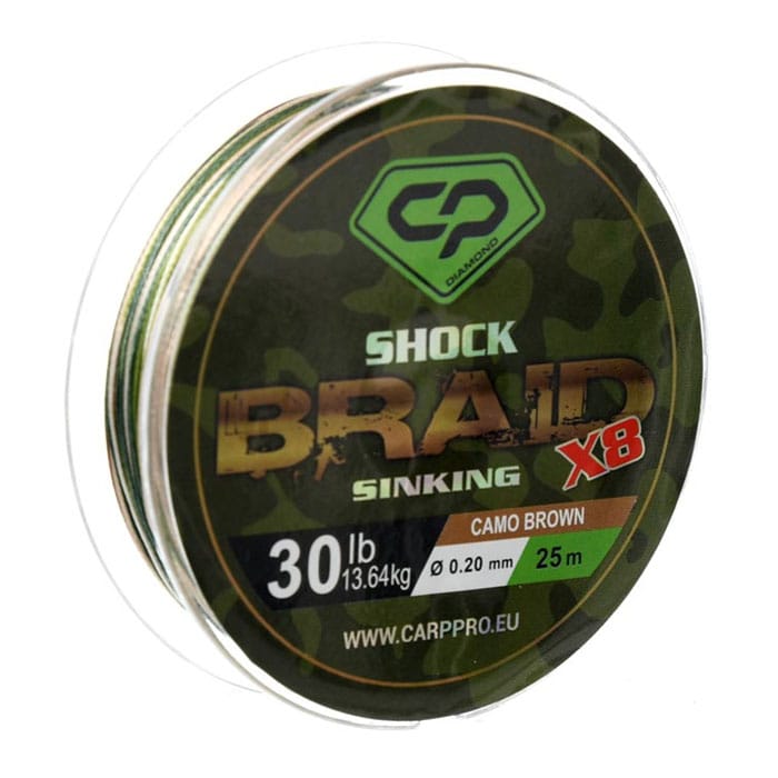 Carp Pro Shock Braid PE X8 – un fir textil pleten sinking, moale, subțire și rezistent la uzură. Este destinat utilizării ca lider de șoc pentru lansatoarele de monturi și marker, precum și pentru pescuitul la distanțe mari. Diametrul mic și culoarea verde închis a firului Shock Braid PE X8 îl fac greu observabil pentru pește. Disponibil în variante cu rezistență la rupere de 25 lb în role de 25 și 50 m. Caracteristicile Carp Pro Shock Braid includ: fir PE de înaltă calitate cu 8 fire, secțiune rotundă, rezistență mare la uzură, suprafață netedă, diametru mic care contribuie la creșterea distanței de aruncare, rezistență ridicată la noduri și imperceptibilitate pentru pește.